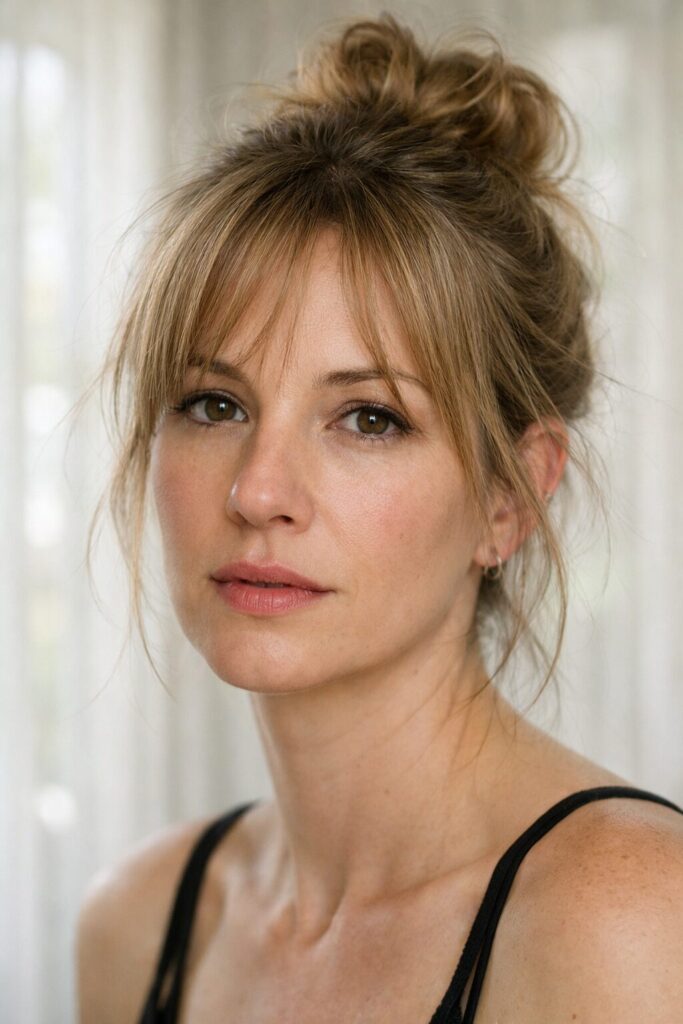 Ask for a loose messy bun with wispy front pieces and a bit of texture at the crown. Use dry texture spray lightly so it stays airy instead of rough.