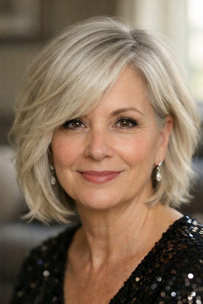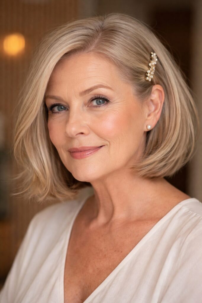 Ask for a bob with a soft bend at the ends and one side pinned back with a clip. Keep the shape smooth and lightly full through the sides.