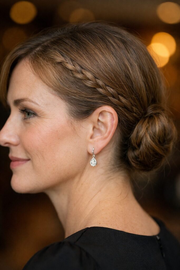 This braided detail gives the style more shape without needing a lot of hair. The braid draws the eye across the side, and the small bun keeps everything neat, which makes fine hair look more put together for a party.