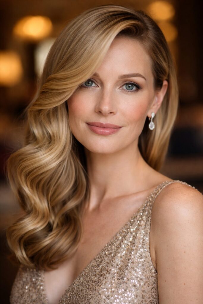 Ask for large side-swept waves with a deep part and smooth brushing through the curls. A lightweight setting spray helps the shape last without making it crunchy.