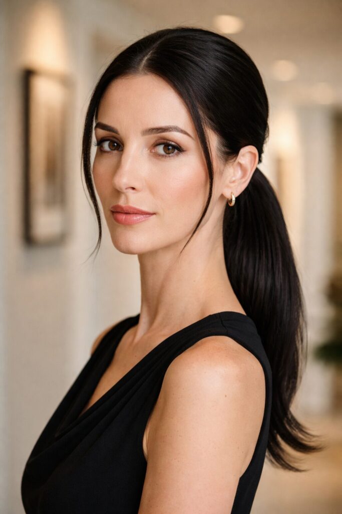 This sleek low ponytail keeps everything smooth and controlled, which can make fine hair look more intentional and clean. The wrapped base gives it a dressier finish, while the long front pieces soften the style so it does not feel too strict.
