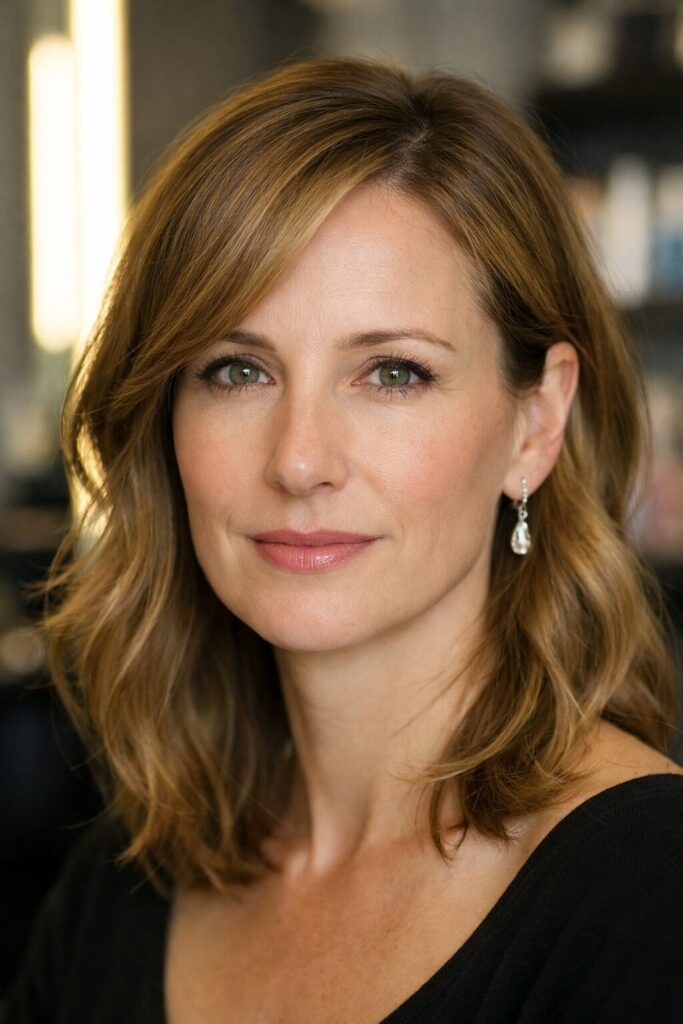 Ask for a lob with a deep side part and soft waves brushed out for an airy finish. Keep the ends light so the shape does not look too heavy.