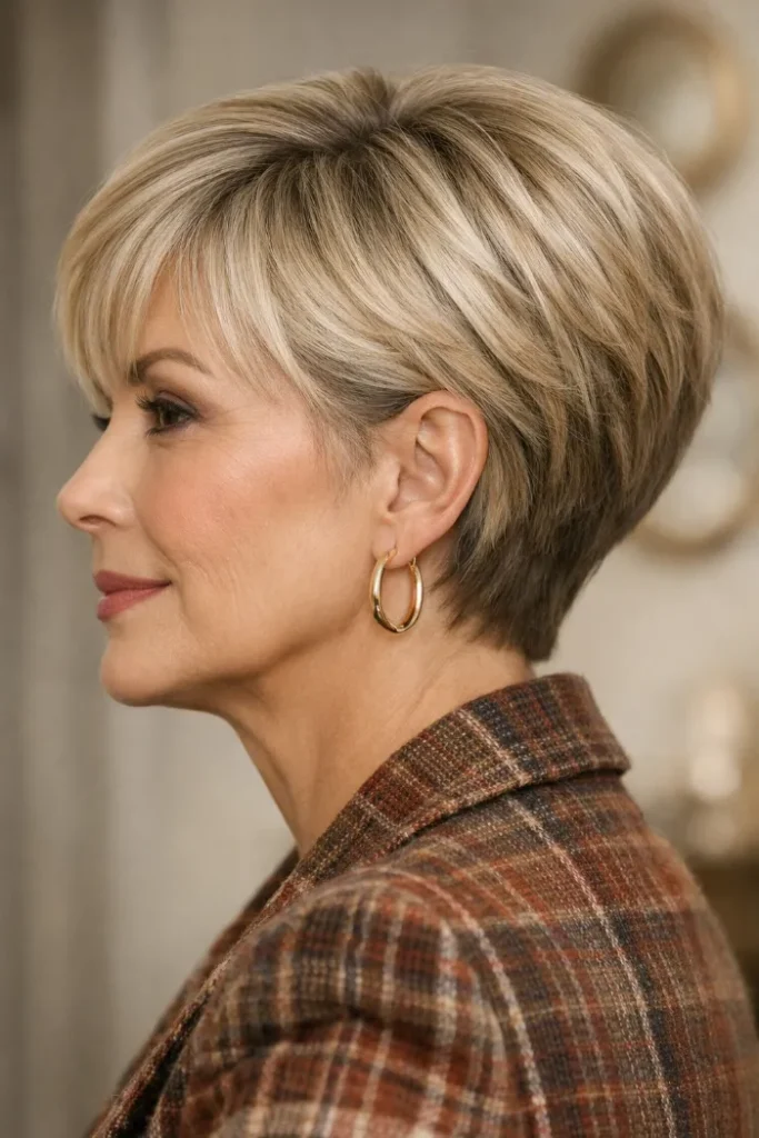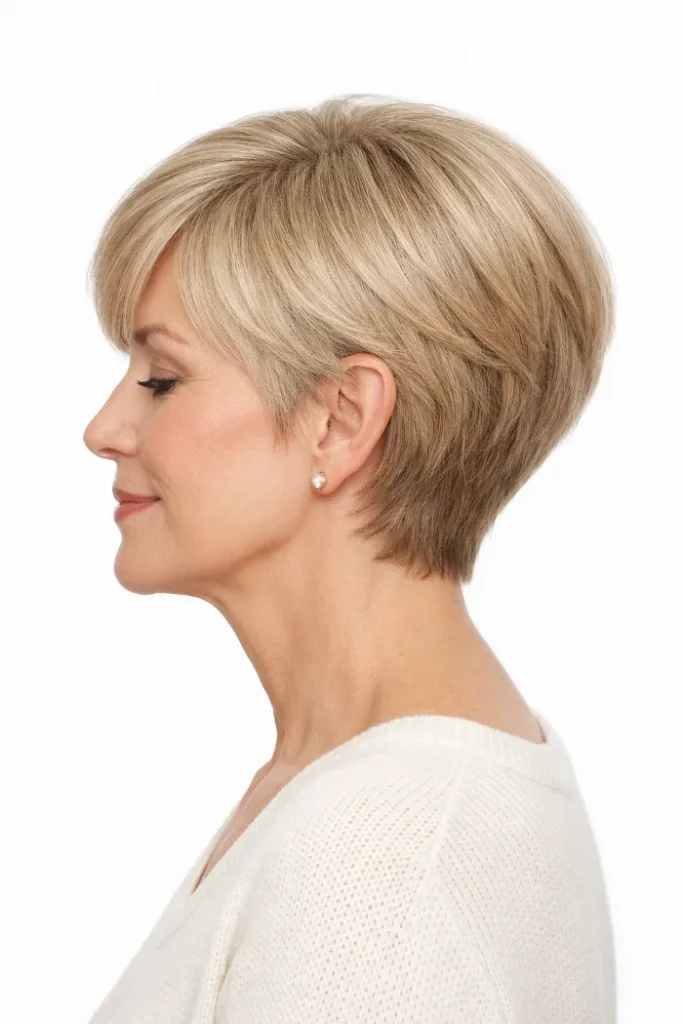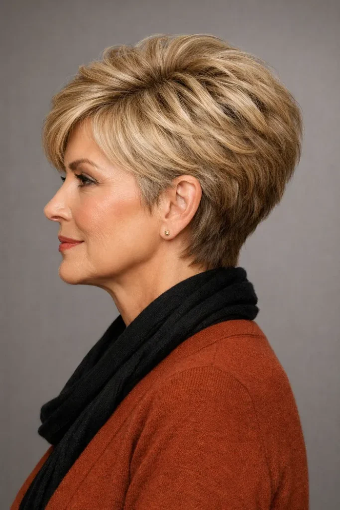 This honey blonde pixie bob uses short textured layers to build lift through the crown and upper back. The result feels full but still controlled, which makes it a practical choice for older women who want body, shape, and easy styling.