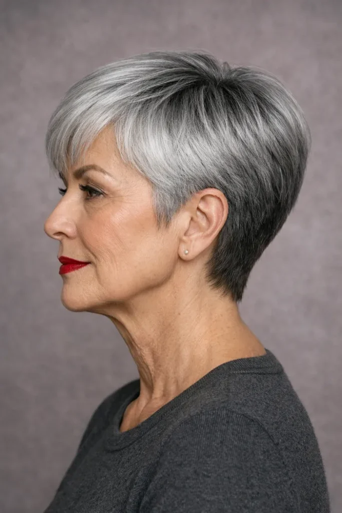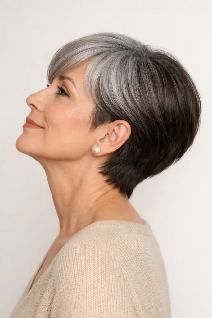 This silver pixie bob leans smooth and sculpted, with a close back and longer top layers that sweep forward cleanly. The shape feels tidy without looking stiff, which makes it a strong choice for older women who like sharp, easy structure.