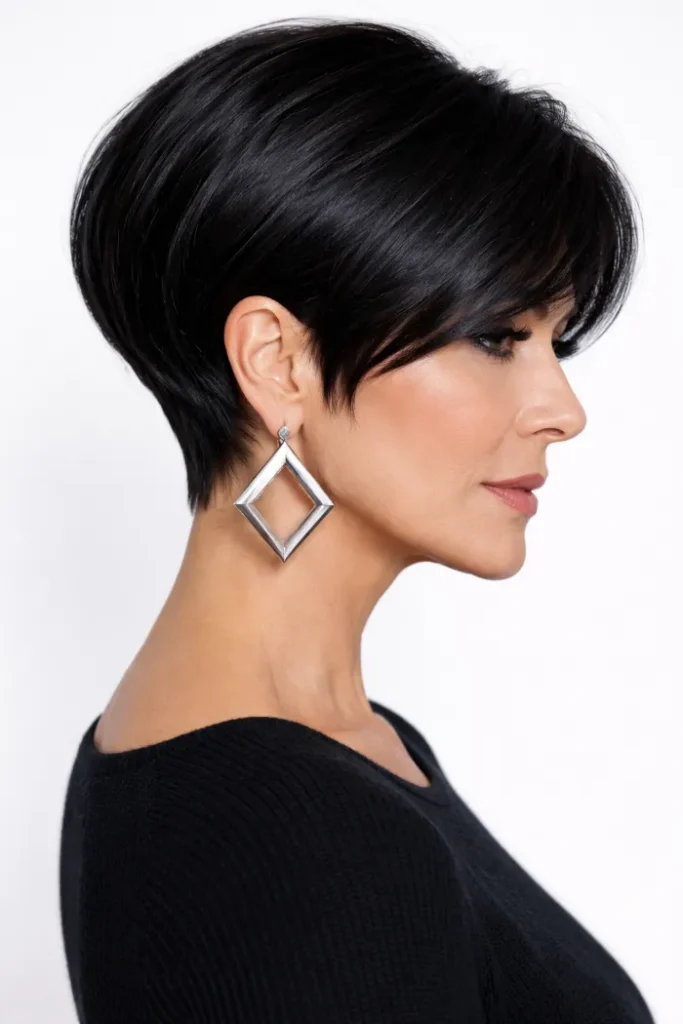 Ask for a smooth pixie bob with a stacked back and longer front pieces that curve toward the face. A shine spray or light glossing cream will help keep the darker color looking rich and the outline crisp.