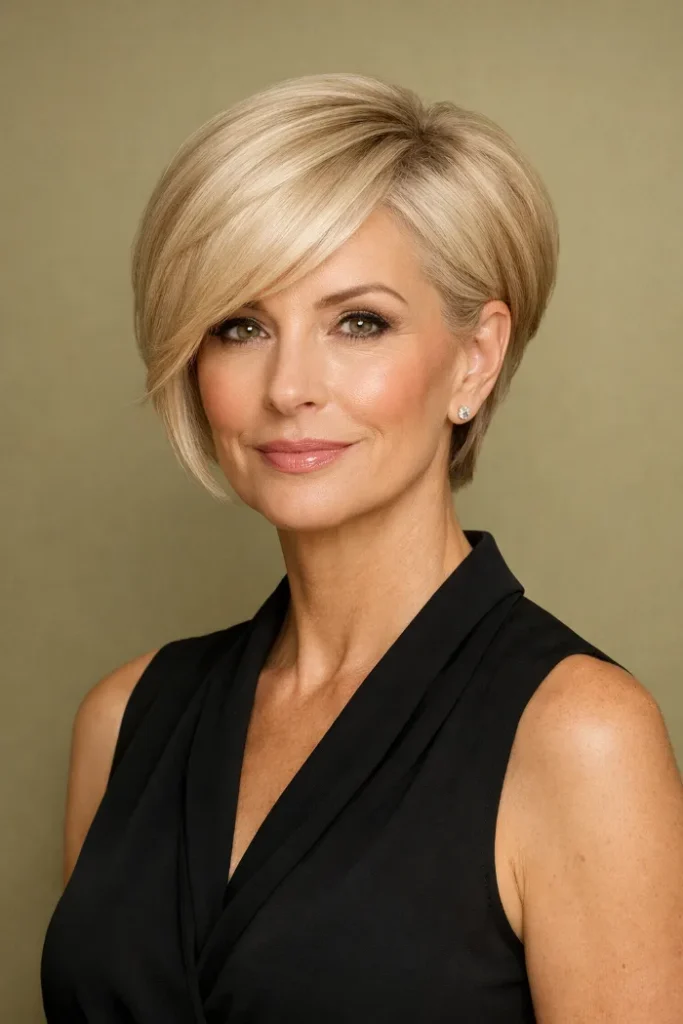 This blonde pixie bob uses a deep side sweep and longer front panel to create softness around the face. The back stays short and tucked in, so the cut feels lifted and elegant while still giving enough length to frame the cheekbone.