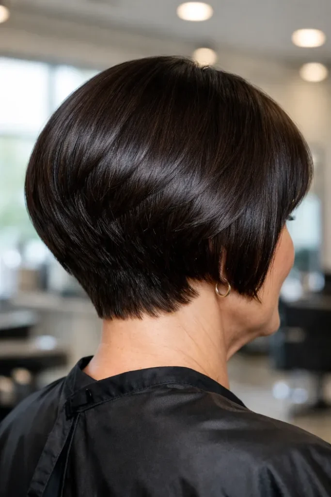 This dark brunette pixie bob has a smooth rounded shape with a clean stacked back that gives it real polish. The longer front sections curve neatly toward the face, which helps the cut look sleek, balanced, and especially flattering from behind.