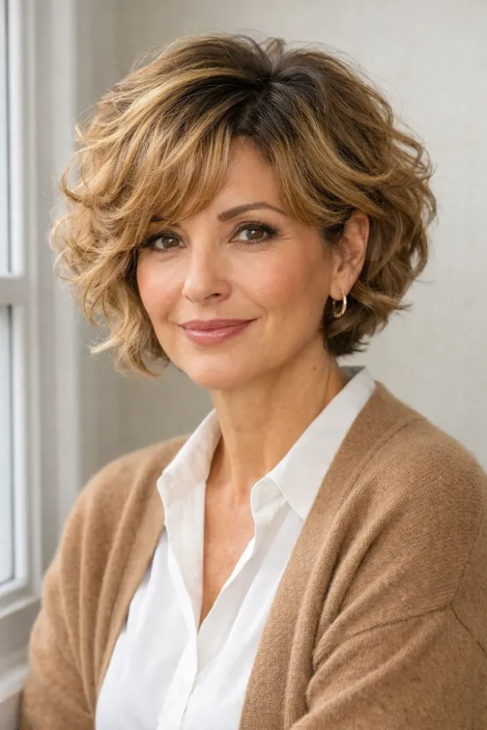 Ask for a pixie bob with soft layered curls and light movement around the sides. Scrunch in a curl cream and diffuse gently to keep the bend defined while still letting the shape feel easy and natural.
