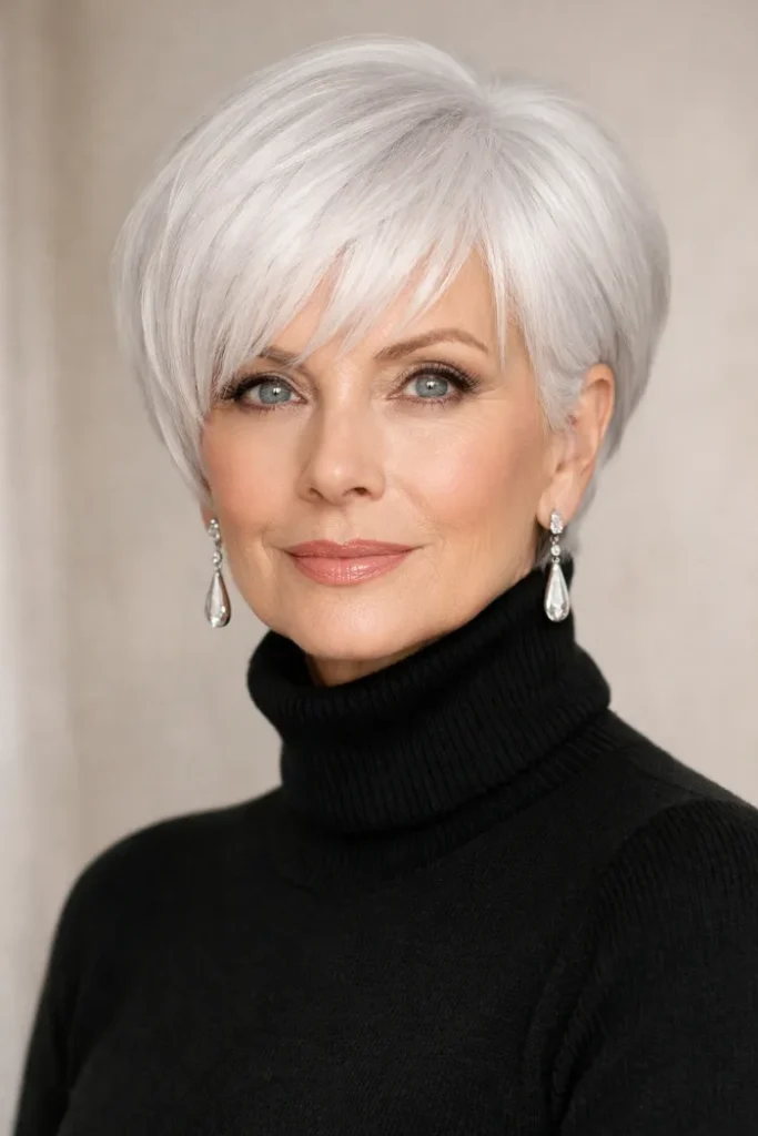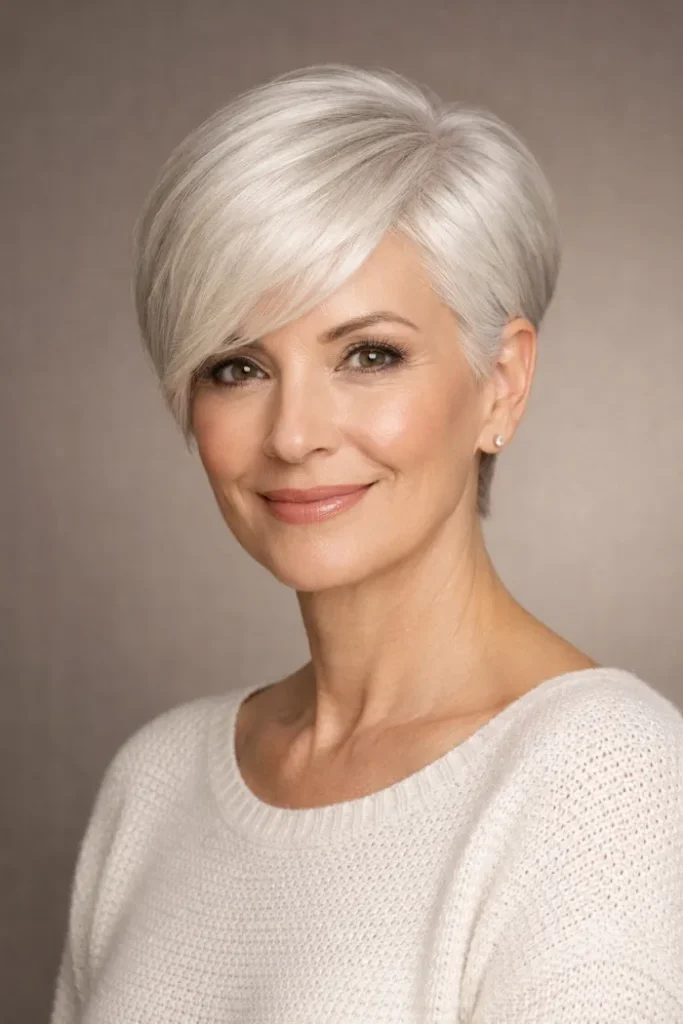 Ask for a sleek pixie bob with a tapered back and longer crown layers styled forward. A flat brush and lightweight serum can help keep the silver tone looking glossy while preserving the clean shape around the head.