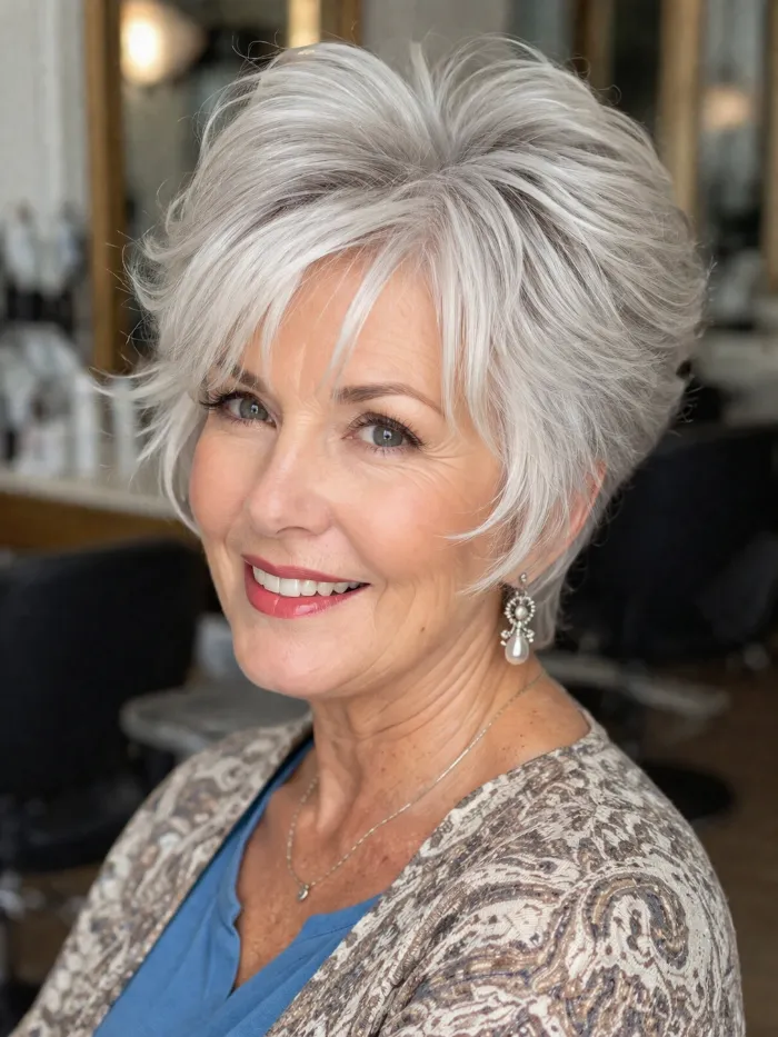 This silver pixie bob has textured layers through the top and crown that give it lift without making it look too full. The side fringe softens the forehead, and the close tapered back keeps the whole style light, fresh, and easy to wear.