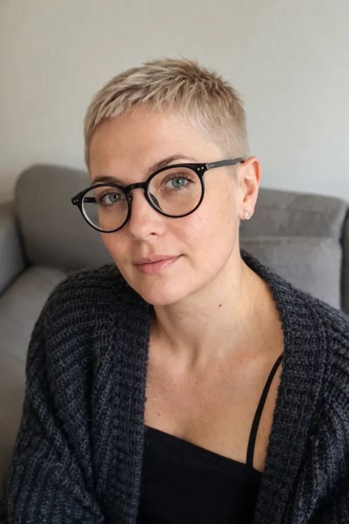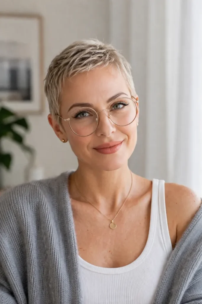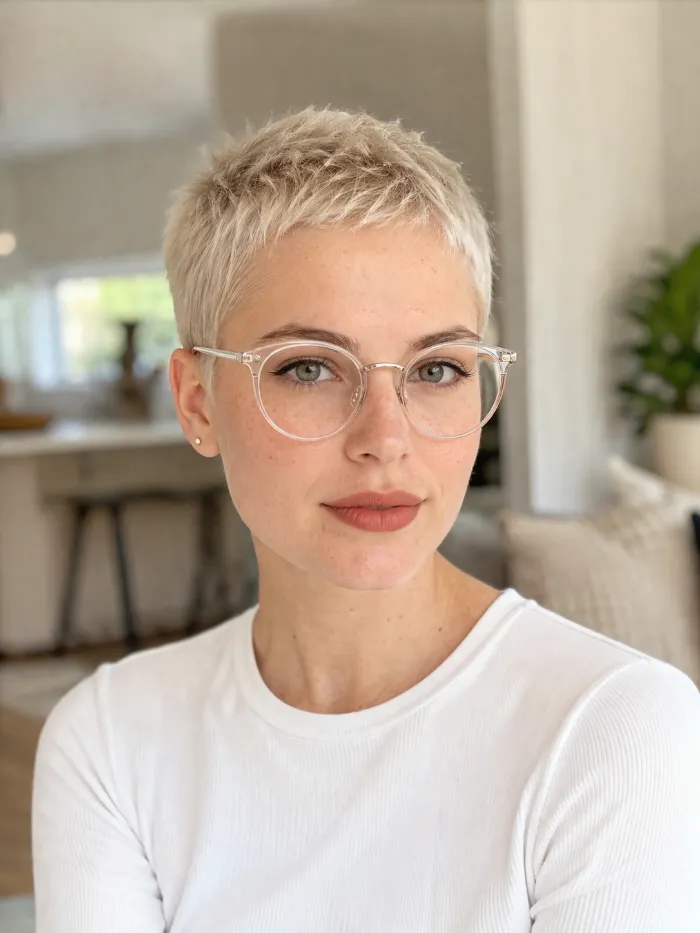 This close blonde pixie is about as simple as it gets, but it works because the haircut leaves the attention on the eyes and glasses. The soft crop feels clean, modern, and easy to wear without needing much daily styling.