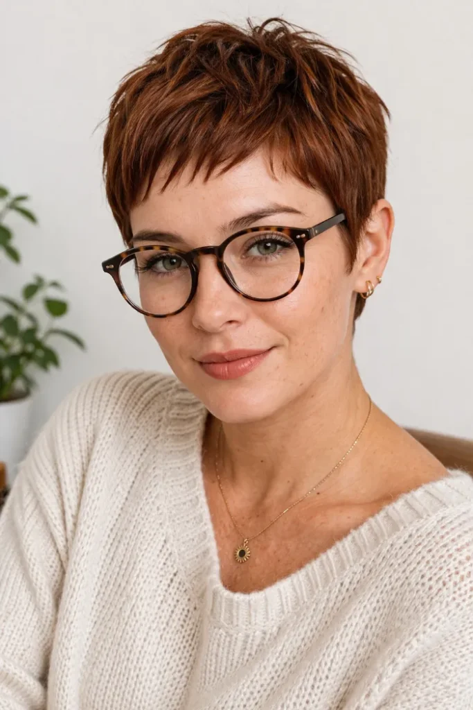 Ask your stylist for a textured pixie with wispy pieces left slightly longer at the front and crown. Keep the sides tapered so the haircut stays light around glasses.