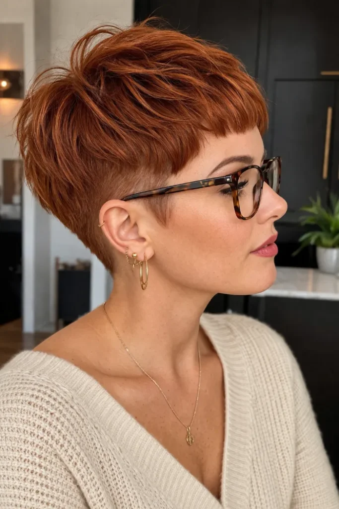 This warm auburn pixie has a softly tousled top and light piecey fringe that works well with fuller glasses frames. The texture keeps the style relaxed, while the richer color gives the short shape more depth and a little extra presence.
