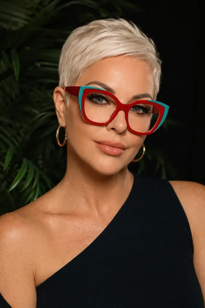 Ask your stylist for a layered pixie with feathered texture through the crown and fringe. Keep the color bright and the sides cropped so the style stays light around the frames.