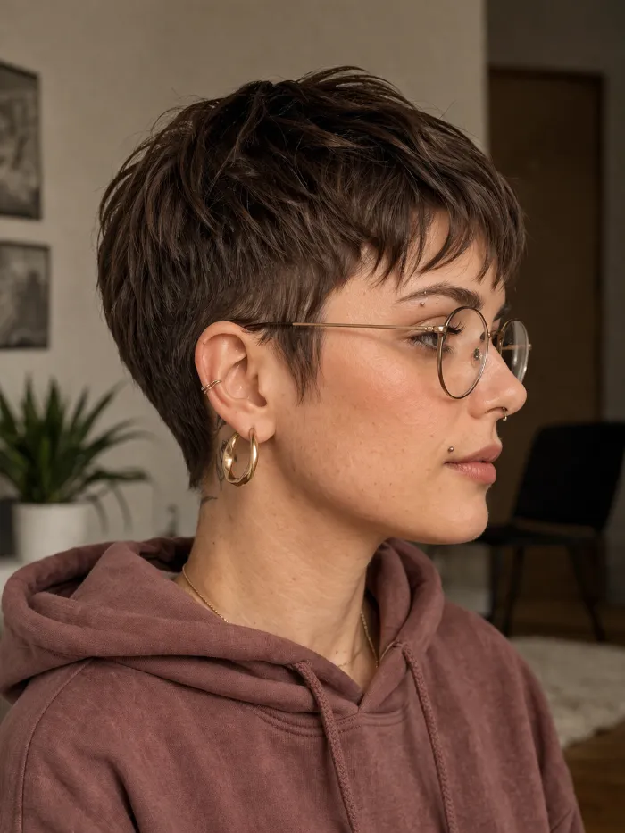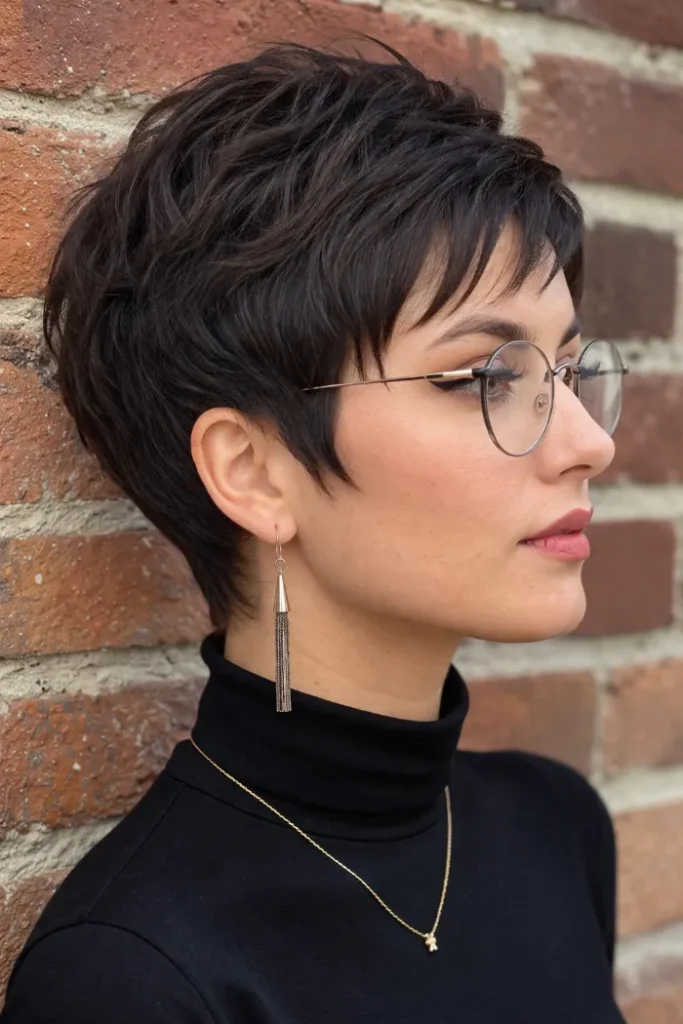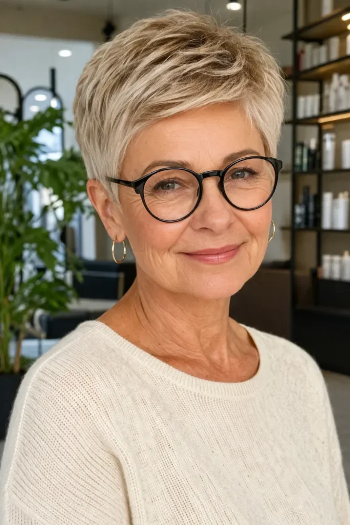 Ask your stylist for a textured pixie with soft volume at the crown and a tapered nape. Leave enough length on top to keep the profile rounded and flattering with glasses.