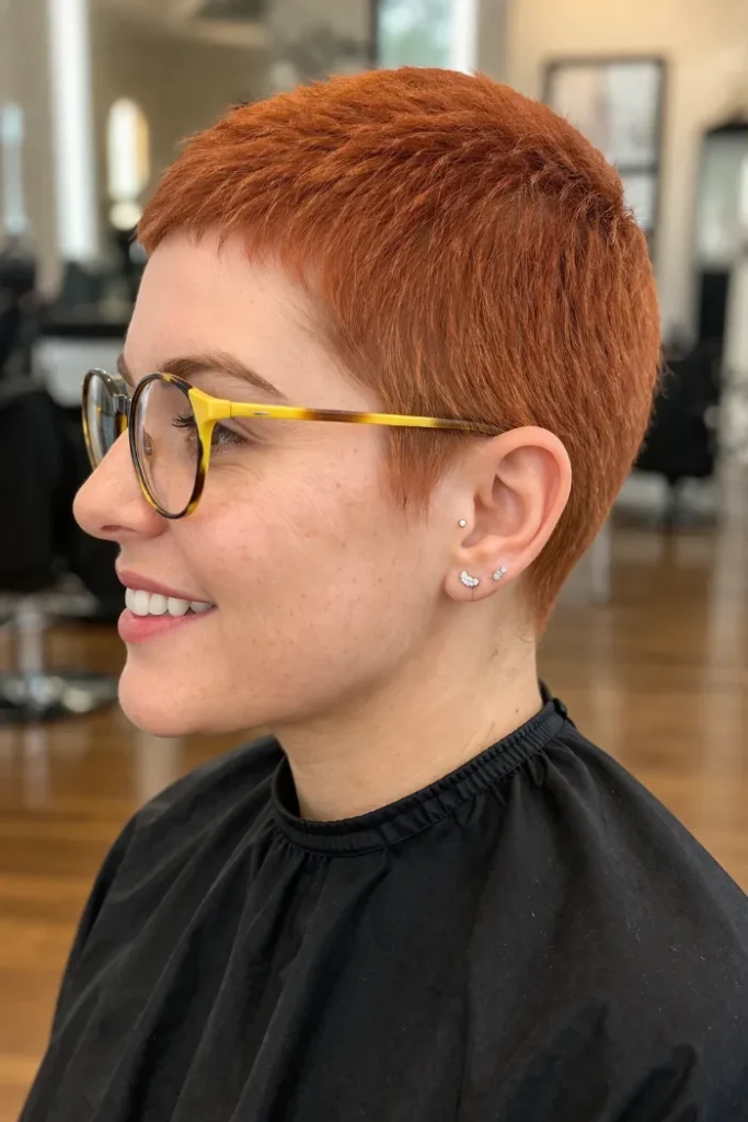 This ultra short copper pixie keeps the outline close and tidy, which makes oversized glasses feel surprisingly wearable. The even crop gives the face a clear frame, while the bright color stops the style from looking too plain.