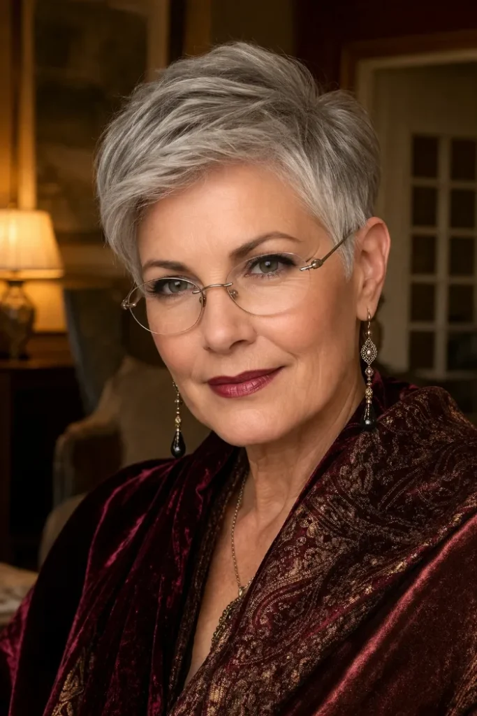 Ask your stylist for a silver pixie with short textured layers on top and a neat taper through the sides. Keep the shape close enough to support bolder frame styles.