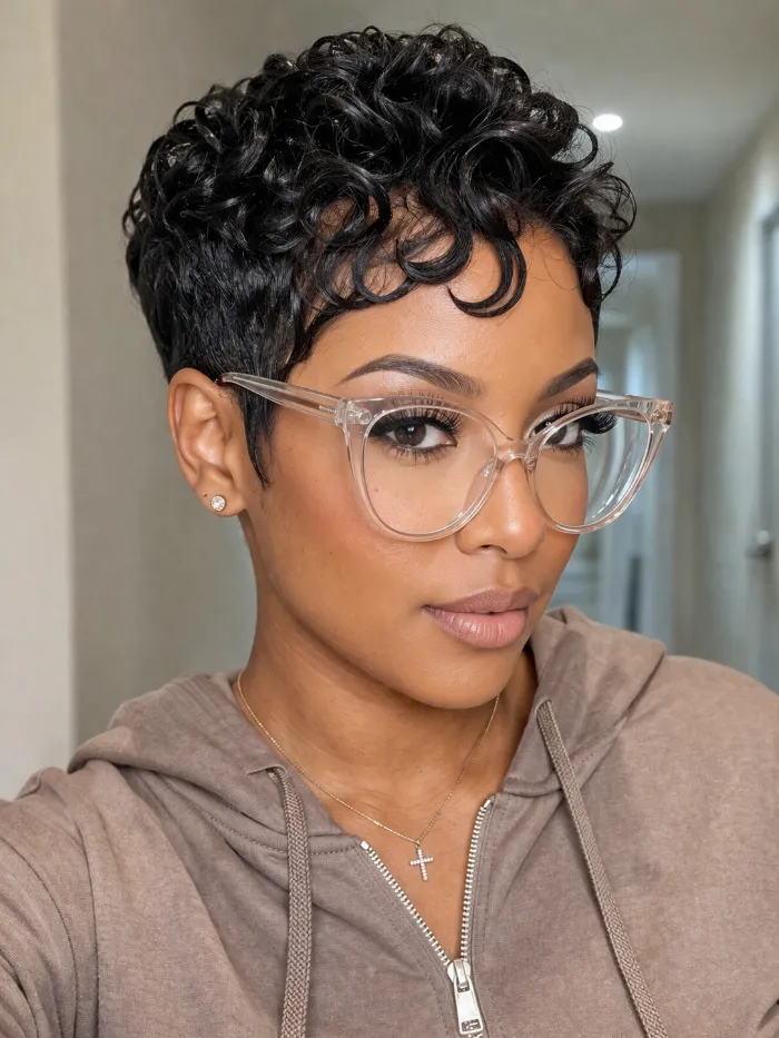 This curly pixie keeps volume at the crown and front, which gives the haircut shape without hiding the glasses. The close sides make the curls feel controlled, and the clear cat eye frames keep the whole look bright and fresh.