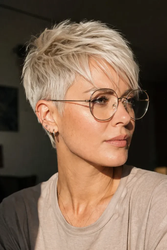 This platinum pixie has airy layers and a few longer front pieces that soften the look of round glasses. The texture adds light movement, while the short sides keep the haircut from feeling too full around the cheekbones.