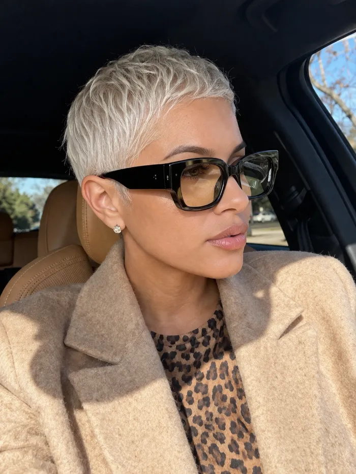 This cropped platinum pixie has a soft waved texture that gives it more shape than a classic close cut. The bold black glasses add contrast, and the short sides help the fuller frames sit cleanly without fighting for space.