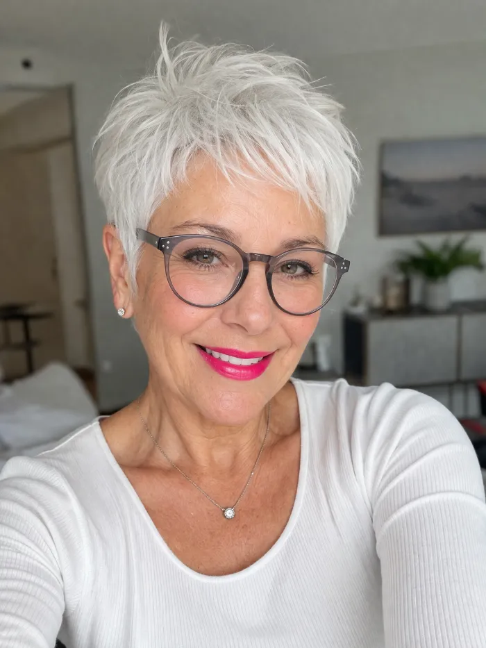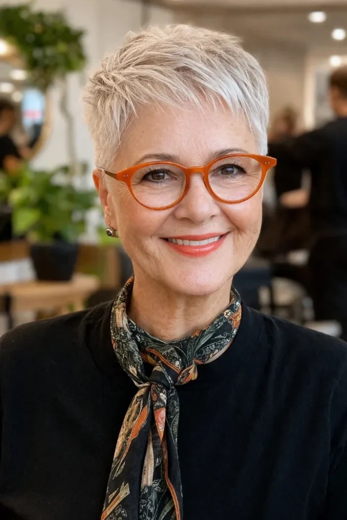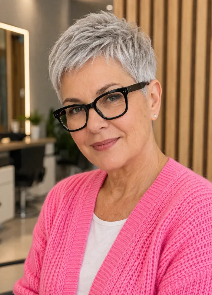 Ask your stylist for a short silver pixie with light crown texture and a soft tapered outline. This works well if you want room for colorful glasses without too much bulk.