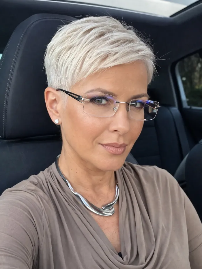 This sleek platinum pixie is brushed smoothly across the top, giving the haircut a very clean line that suits rimless glasses well. Because the sides stay close, the whole look feels sharp, tidy, and easy to keep polished.