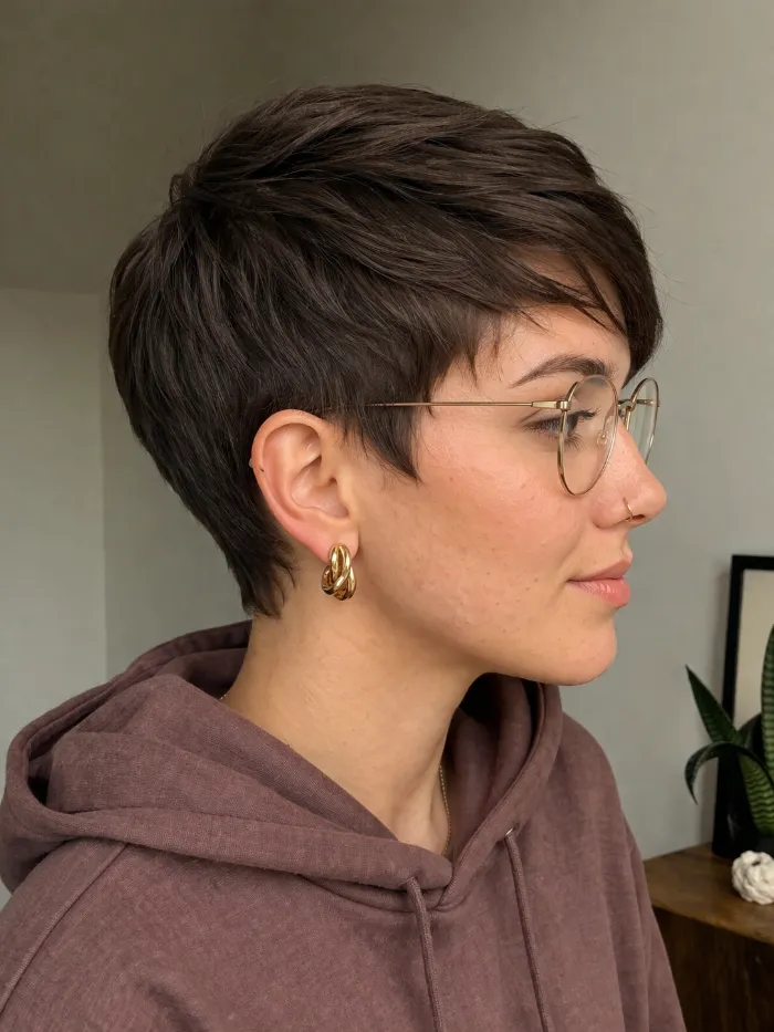 This tapered brunette pixie has a smooth side profile with enough length on top to soften the short back. It works well with glasses because the area around the ears stays clean, while the crown still gives the haircut some shape.