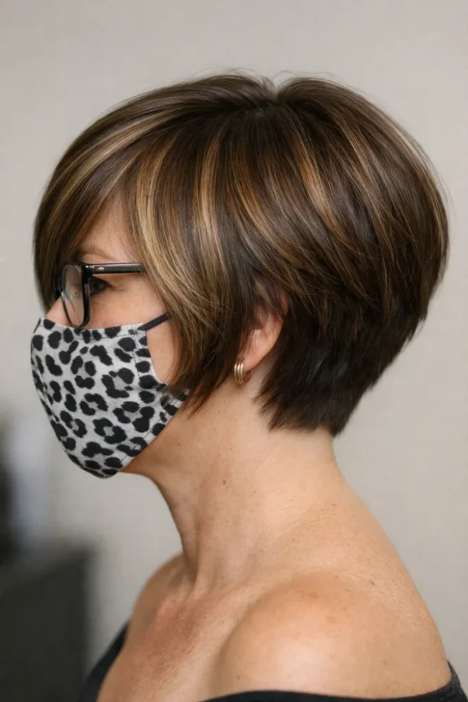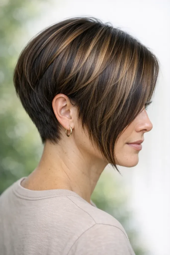 This stacked bob keeps its volume in the back and crown, then softens the look with a side fringe at the front. The shape feels neat but not strict, and the brunette highlights help the layering show up more clearly without making the style look overdone.