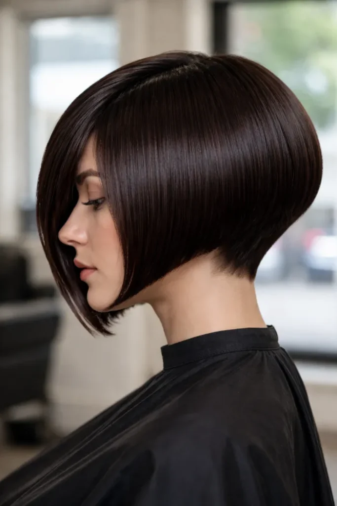 This sleek stacked bob stands out for its rounded shape, clean graduation, and mirror-like espresso finish. The longer front gives it a polished edge, while the close, tapered back keeps the silhouette smooth, compact, and very controlled without looking flat or stiff.