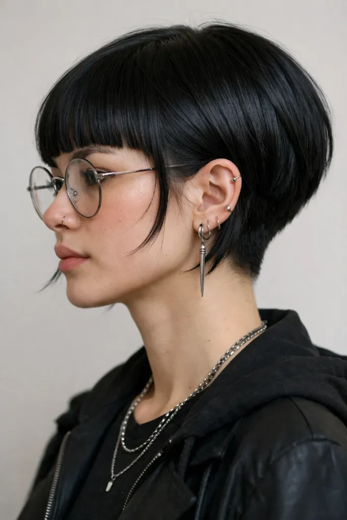 This black stacked bob has a compact rounded shape with a short fringe that gives it a bold, graphic feel. The close back keeps the nape clean, while the curved sides and face-framing tendrils stop the cut from looking too severe or heavy.