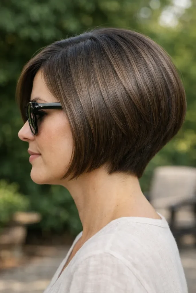 This stacked bob uses a longer front piece to create a sharp, face-framing line, while the shorter back keeps the shape lifted and neat. The brunette base with warm highlights adds movement, which helps the cut look fuller and more detailed from every angle.