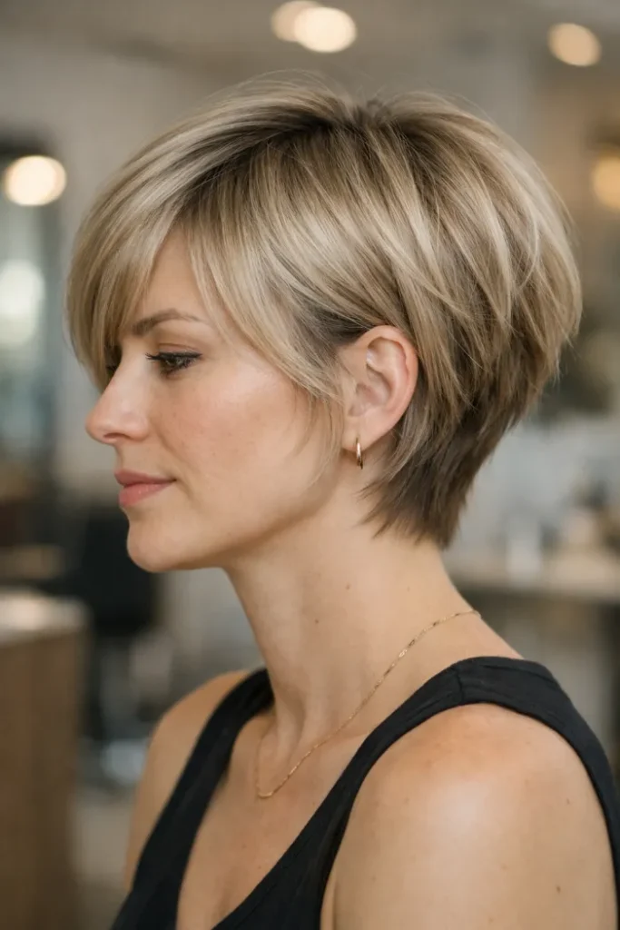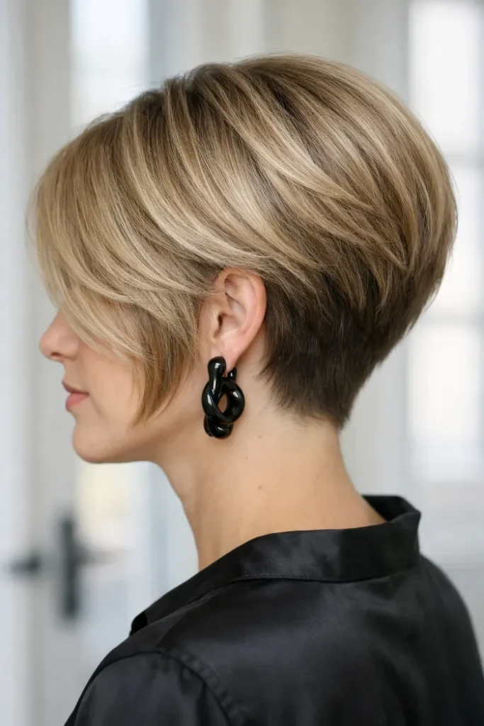 This layered bixie-stacked bob blends the fullness of a bob with the lighter finish of a pixie. The shorter back adds lift, while the soft layers around the crown and front keep the shape airy, relaxed, and easy for women who want movement without bulk.