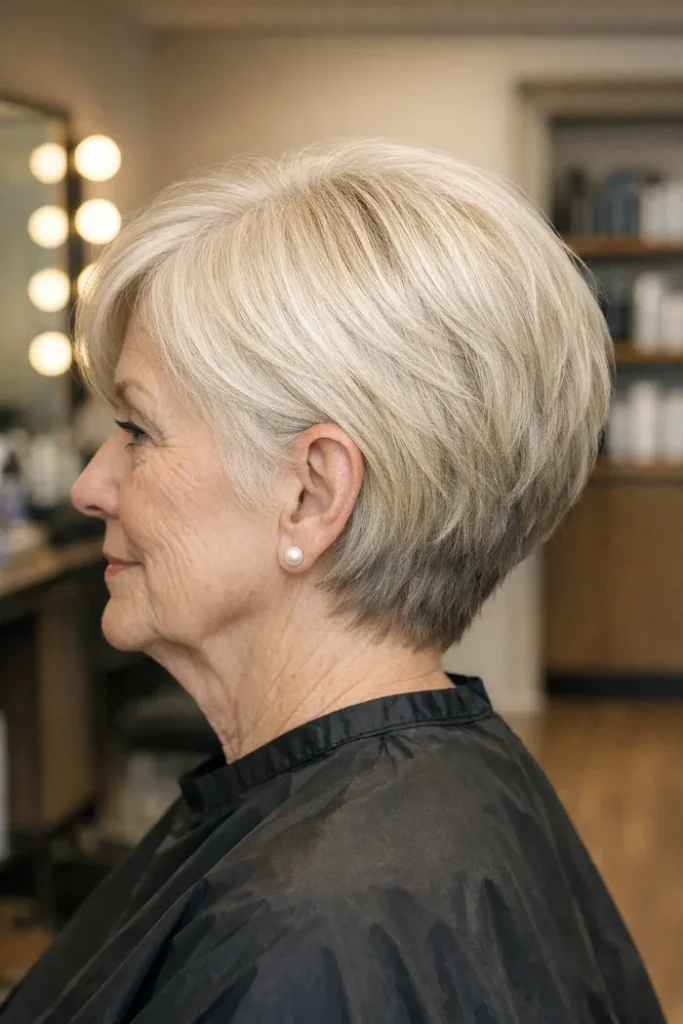 This soft platinum stacked bob has a gentle rounded silhouette that lifts the back without looking stiff. The light color makes the layering more visible, while the side-swept front keeps the cut flattering and easy, especially for anyone who wants shape without harsh lines.