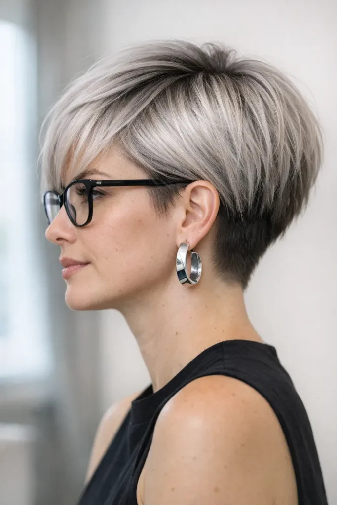 This pixie-inspired stacked bob combines a close undercut back with a fuller top section for contrast. The result feels light, modern, and easy to style. The cool blonde shade also helps the texture stand out, especially around the crown and longer front pieces.