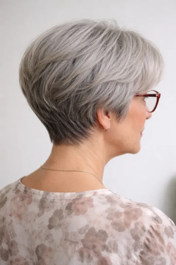 This silver stacked bob uses soft feathering through the crown and back to keep the shape light and flattering. The natural gray tones add depth instead of looking flat, and the rounded build at the back helps finer hair appear fuller and better balanced.