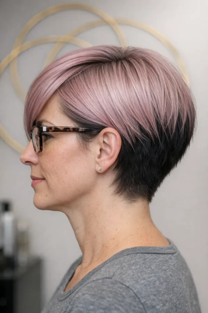 This undercut stacked bob stands out with its dusty rose color and smooth, rounded top section. The darker underlayer keeps the shape defined, while the close back removes bulk and makes the pastel tone feel more grounded, modern, and surprisingly wearable.